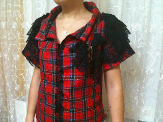 annemin çok uzun bir zamandır sakladığı eteklik kumaştan gömlek tasarladım..elimde hiçbir kalıbım olmadan direk hazır bir gömleğim vardı onun üzerinden biçe biçe -aşırı bir amatörlükle- tamamladım..ilik ve düğme aparatım olmadığı için gömlek gibi değilde bir tişört gibi giyilip çıkarılıyor..düğme eksikliğini de siyah dantelle gidermeye çalışarak kol ve yakasında biraz farklılık yaratmak istedim..hiç de fena durmuyor yahu.. :)